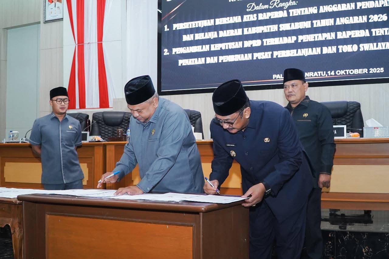 Dalam rapat tersebut, DPRD membahas sekaligus menyetujui dua rancangan peraturan daerah (Raperda) strategis, yaitu Raperda tentang Anggaran Pendapatan dan Belanja Daerah (APBD) Kabupaten Sukabumi Tahun Anggaran 2026 serta Raperda tentang Penataan dan Pembinaan Pusat Perbelanjaan dan Toko Swalayan.