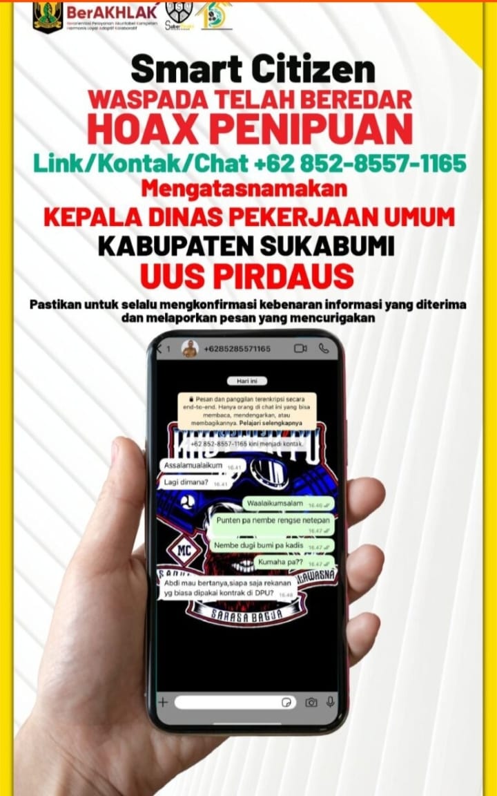 Dinas PU Kabupaten Sukabumi menegaskan komitmennya untuk terus mendorong kesadaran digital masyarakat (Smart Citizen) agar lebih bijak dan waspada terhadap berbagai bentuk penipuan daring yang mengatasnamakan instansi pemerintah.