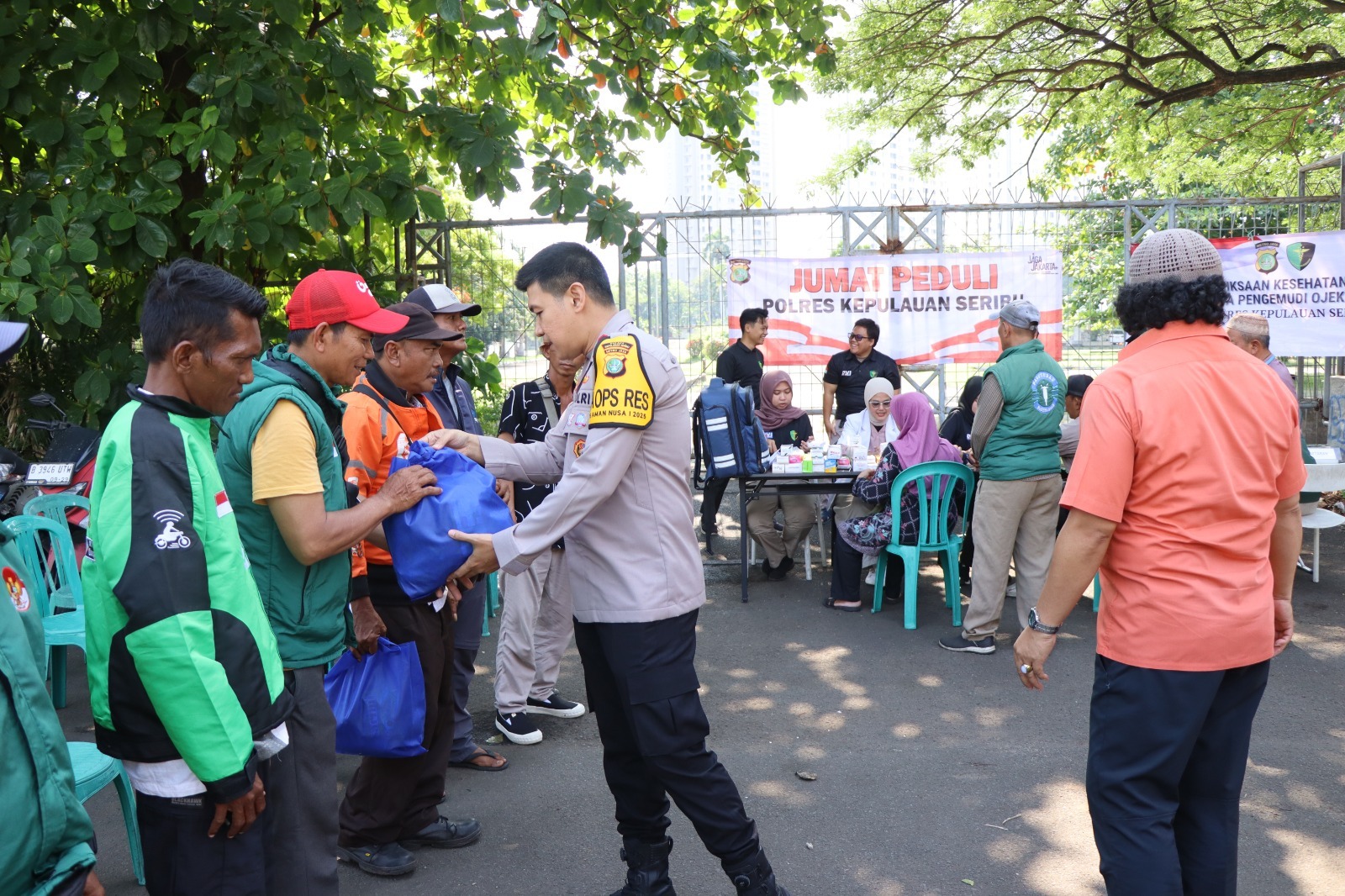 Kegiatan sosial ini dipimpin langsung oleh Kapolres Kepulauan Seribu AKBP Argadija Putra, S.I.K., M.Si. bersama jajarannya. Para pengemudi ojol tampak antusias mengikuti pengecekan kesehatan yang meliputi pemeriksaan tekanan darah, gula darah, dan konsultasi medis ringan.