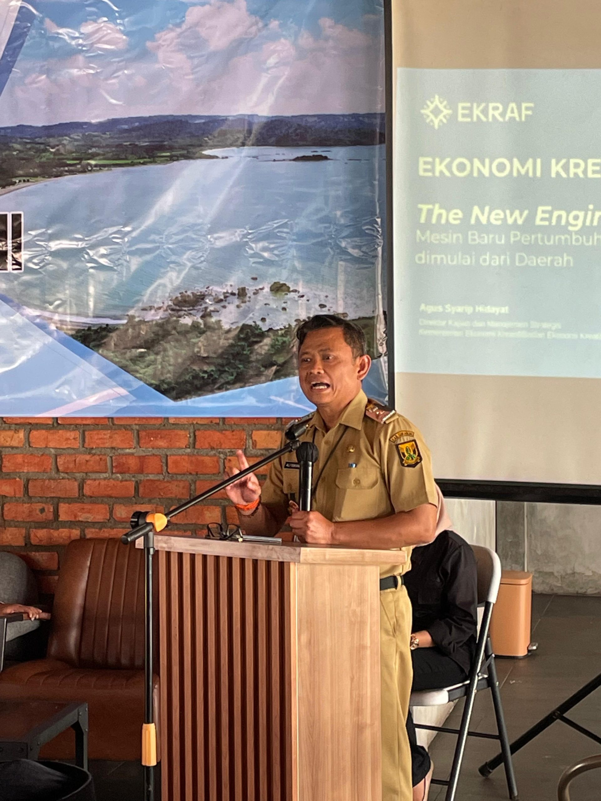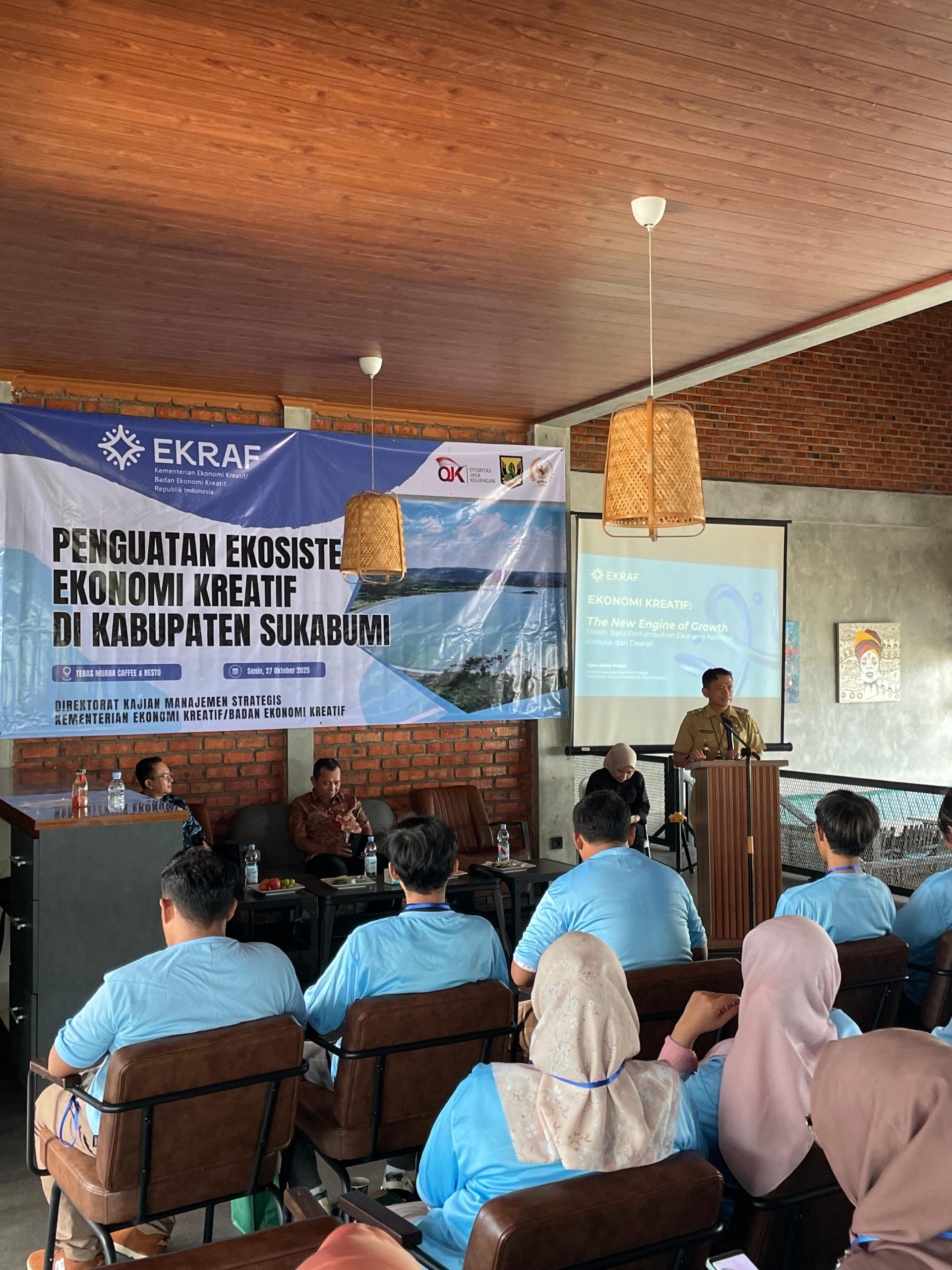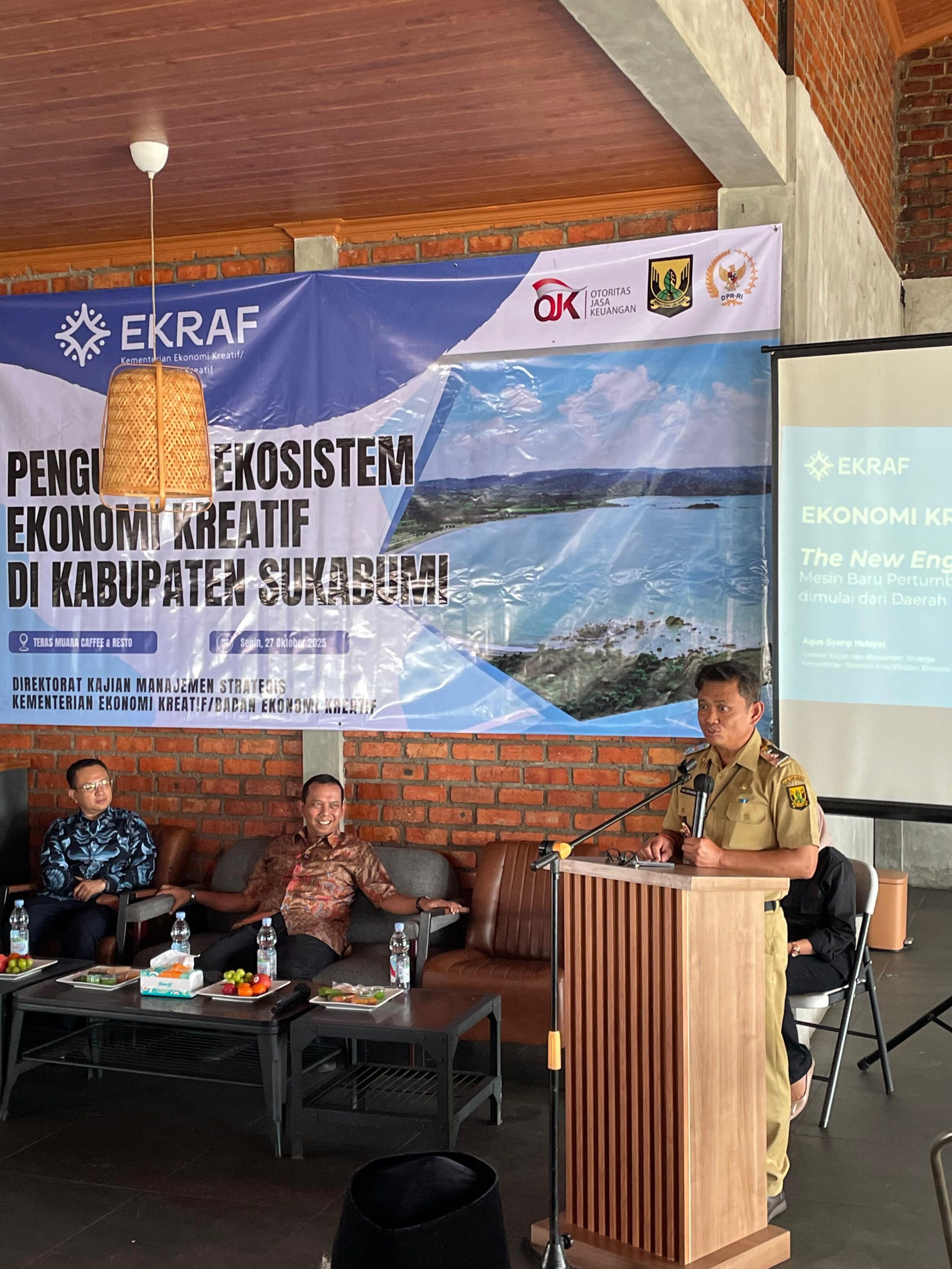 INDVESTA.ID – Kepala Dinas Pariwisata Kabupaten Sukabumi menyampaikan sambutan yang membakar semangat Para Pelaku Ekonomi Kreatif dalam acara Pembukaan Pelatihan Pelaku Ekonomi Kreatif yang diselenggarakan oleh Kementerian Pariwisata dan Ekonomi Kreatif (Kemenparekraf/Baparekraf) dan Anggota DPR Fraksi VII Dapil Sukabumi Bapa Iman Adinugraha, SE, AKT Bertempat di Teras Muara, Palabuhanratu, Senin 27/10/2025.