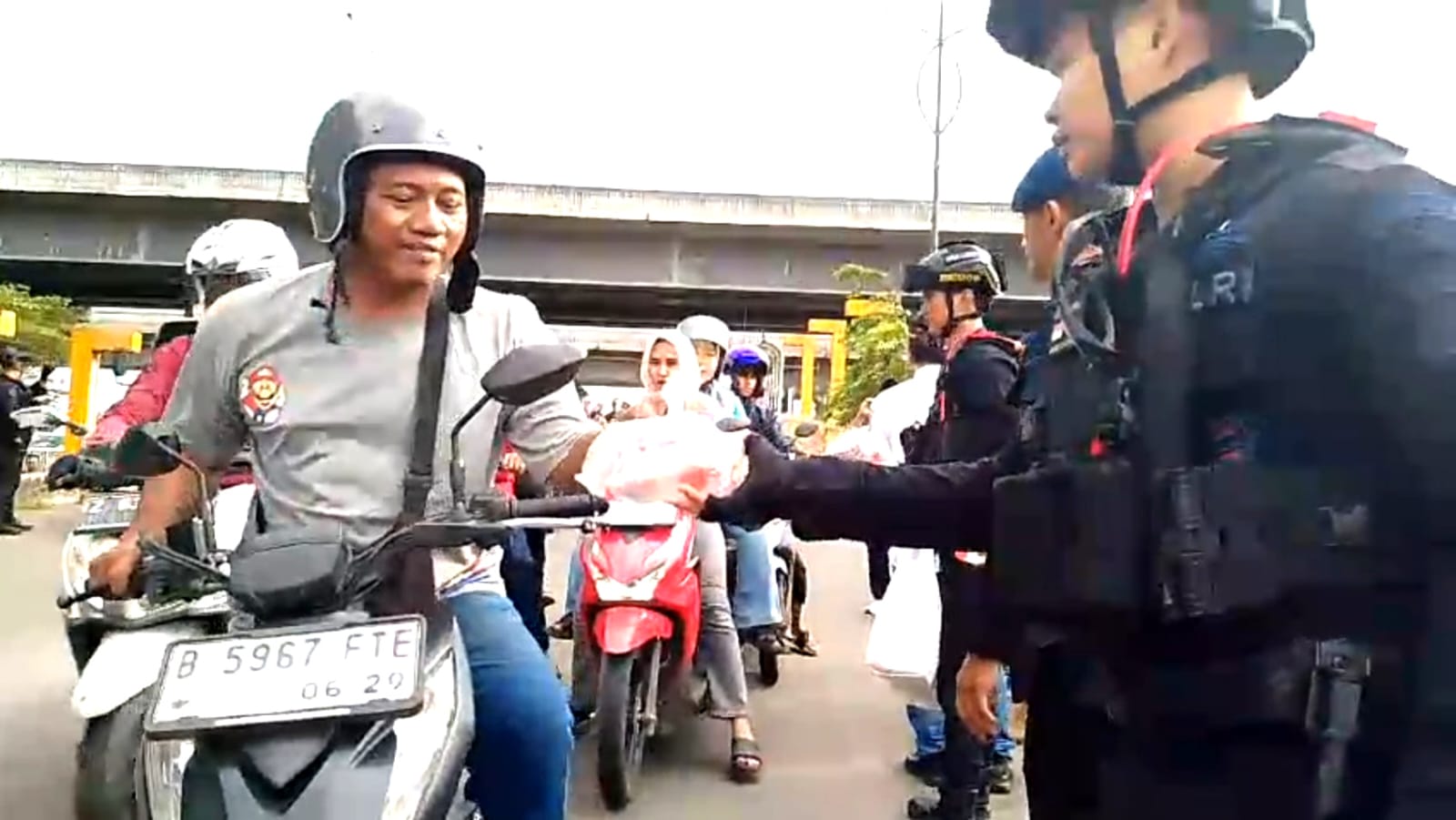 Dalam pantauan media, sebanyak 200 paket takjil dibagikan kepada pengendara sepeda motor, mobil dan pejalan kaki yang melintas di sepanjang jembatan tol Tegaldanas, Cikarang Pusat, Kabupaten Bekasi.