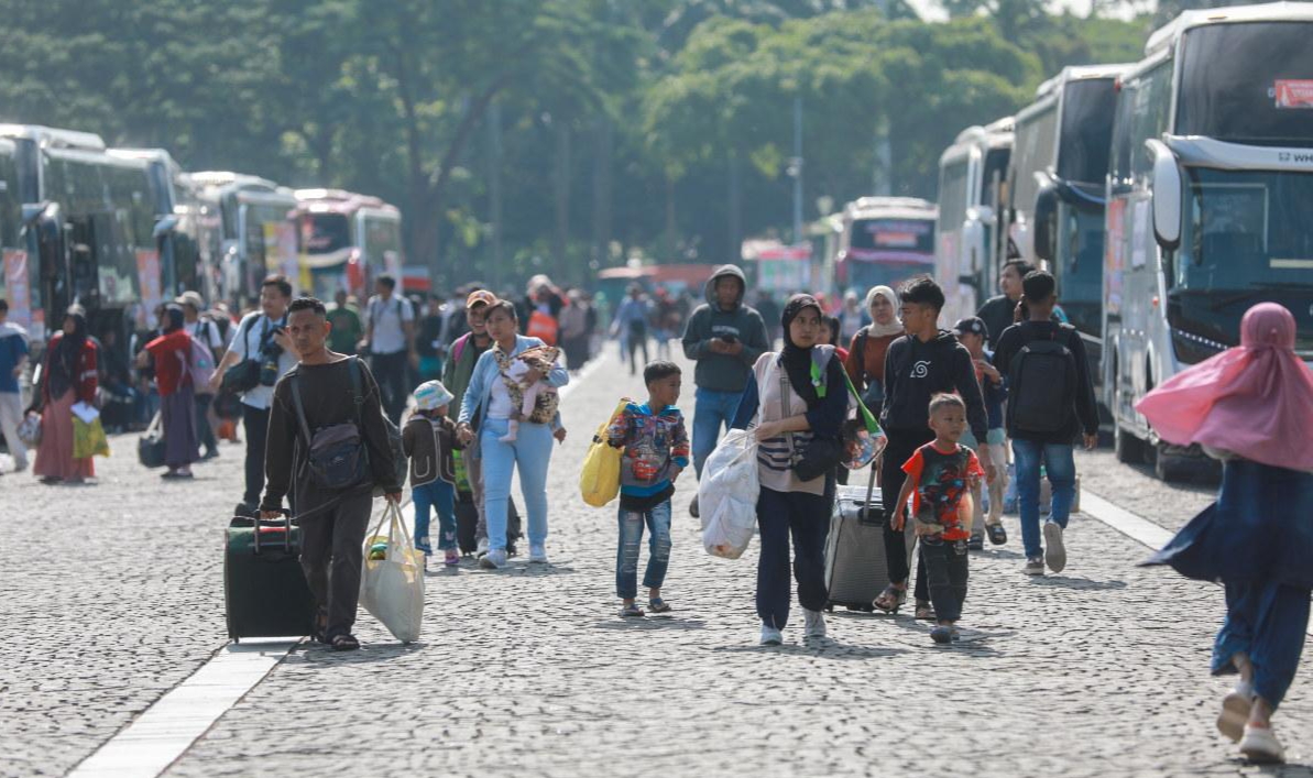 INDVESTA.ID – Suasana di kawasan Monumen Nasional (Monas) pada Selasa (17/3) pagi, tampak padat dipenuhi oleh para peserta mudik gratis yang akan berangkat ke berbagai kota menggunakan ratusan armada bus.