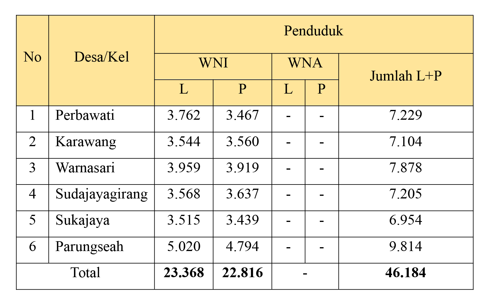 Daftar Desa: Terdiri dari 6 desa, yaitu Karawang, Perbawati, Sudajaya Girang, Sukajaya, Parungseah, dan Warnasari.